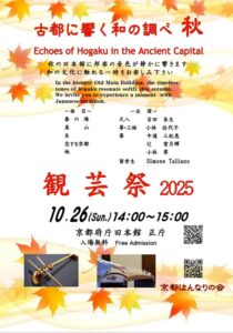 観芸祭2025『古都に響く和の調べ 秋』 2025.10.15 Share この記事のタイトルとURLをコピーする 10月26日(日)14時〜15時 京都府庁旧本館正庁で演奏会開催 尺八は吉田長生さんです。 宮城道雄と初めて春の海を演奏された吉田清風の曽孫さんです。 入場無料 是非お越し下さいませ☆ Share Hatena この記事のタイトルとURLをコピーする 令和7年京都府庁旧本館「観芸祭」 前の記事
