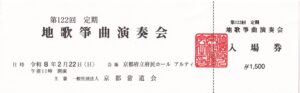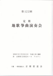 第122回 定期 地歌箏曲演奏会 2026.01.18 Share この記事のタイトルとURLをコピーする 第122回 定期 地歌箏曲演奏会 令和8年2月22日(日) 入場料1,500円 私は「夕顔替手 楠の露」を演奏します チケットございますのでお気軽にお声掛けください。 Share Hatena この記事のタイトルとURLをコピーする 第六十二回 三味線組歌演奏会 前の記事